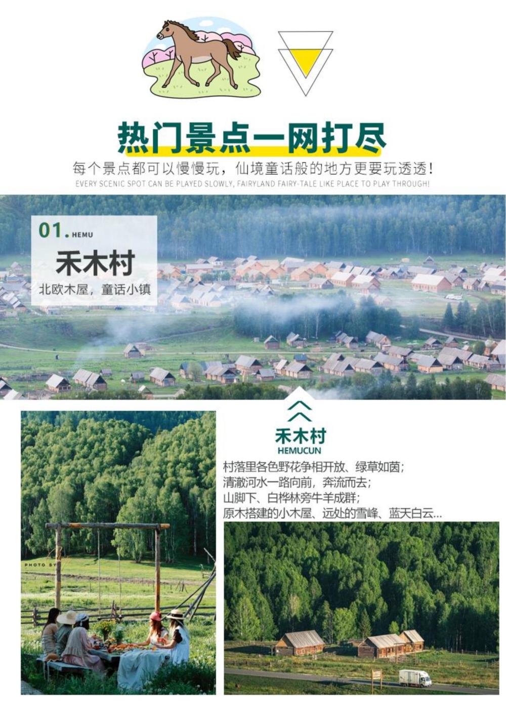 约 17:00 乘车前往【禾木风景区】(含景区首道门票+区间车,晚上住禾木村)19:30 抵达禾木停车场后,乘坐区间车进入景区前往木屋酒店办理入住(禾木门票站换乘区间车时请将大件行李放在旅游车上,只携带贵重物品及洗漱用品进入景区)。在禾木村周围的观景平台可俯视禾木村以及禾木河的全景,层林浸染,绚丽多彩。在禾木美丽峰草原骑马或徒步,感受草原牧民生活有兴致的小伙伴可徒步前往美丽峰草原,5 公里左右,也可自费骑马体会草原民族奔驰在山间原野的感觉。可自由活动或前往观景台,欣赏拍摄日落下的禾木。晚上入住禾木村。