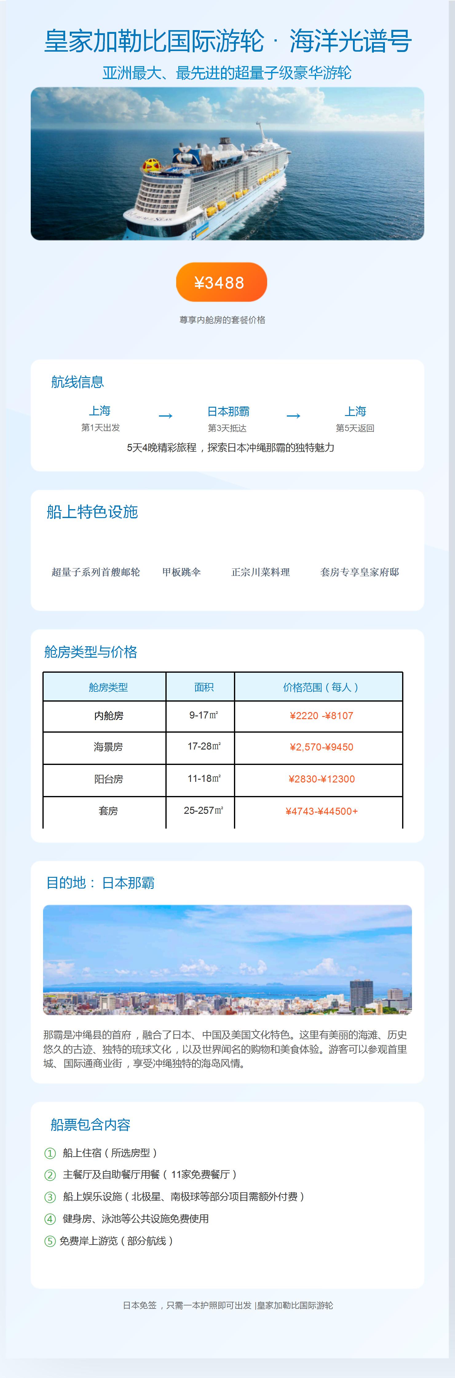 今天迎来全天的邮轮海上巡游,让轻松舒适来开启您的邮轮之旅。您可以根据自己的喜好,享受船上的休闲娱乐设施及各式美食,体验丰富多彩的娱乐项目。